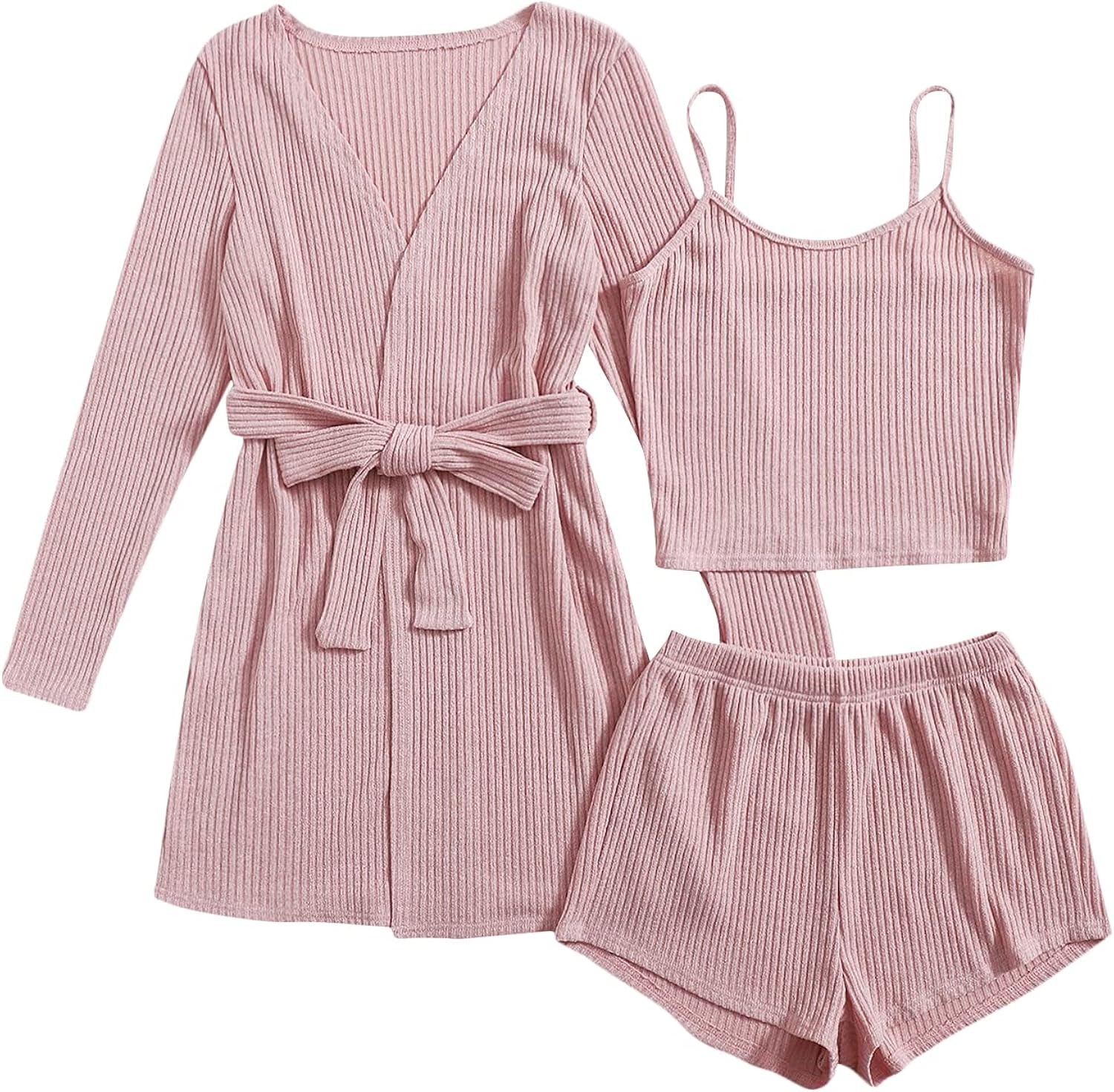 95% Polyester, 5% Spandex Imported Pull On closure Cute knitwear loungewear set cami top with shorts pj sets Soft and comfortable fabric, fabric has some stretch Feature: Spaghetti strap,short sets,comfy pajamas,tie front,matching set with belted robe,fashionable Occasion: Sleepwear, loungewear, nightwear, valentines day outfit, comfy pajama set for a relaxing day or night Size recommendation: Please refer to size chart which we provide in our photos (not amazon's)